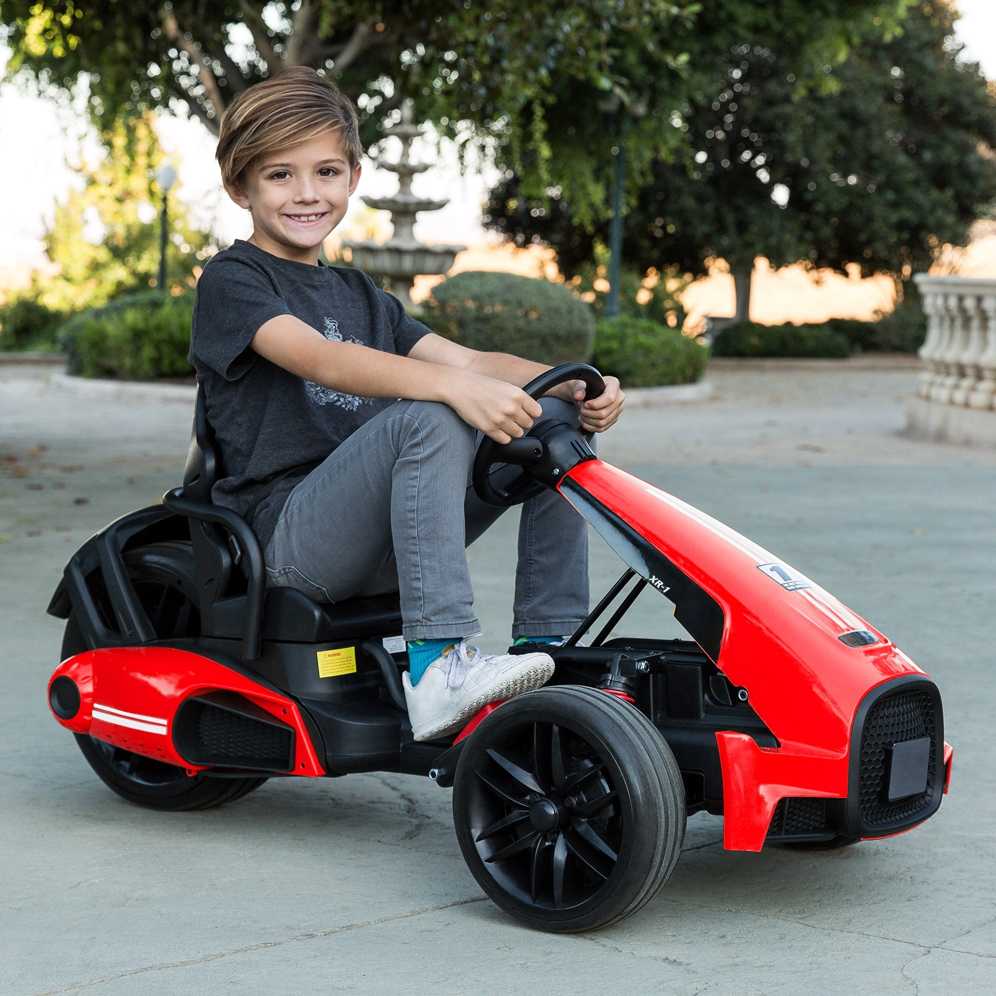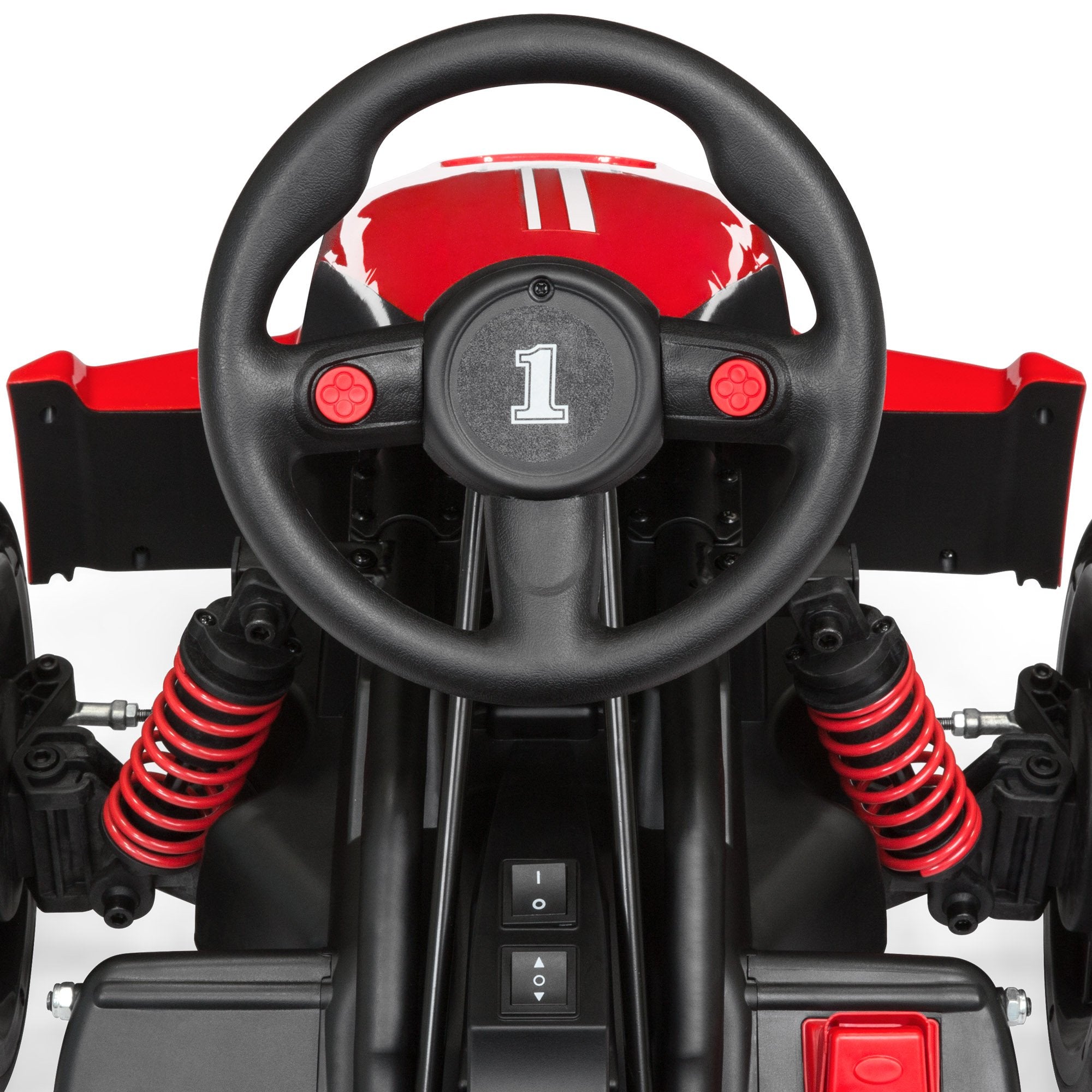 Operated by a realistic foot pedal accelerator and an adjustable steering wheel for a true racing experience