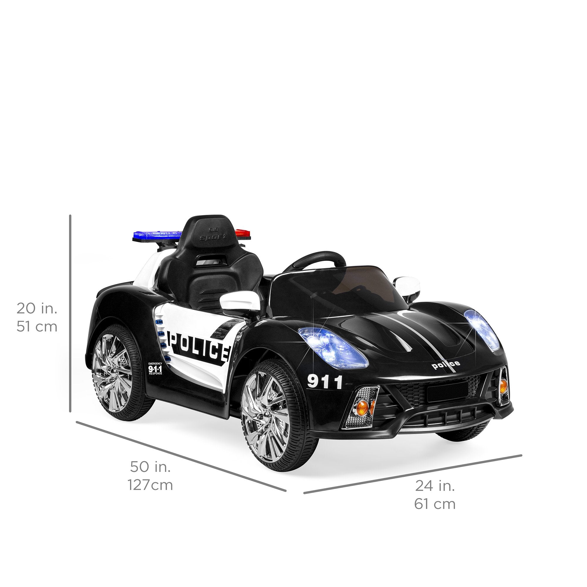 • EXCITING POLICE CAR DESIGN: Looks like a real cop car, with black and white body coloring, police decals along the side, and red and blue LED lights that border the rear so your child can feel like the coolest little officer in training