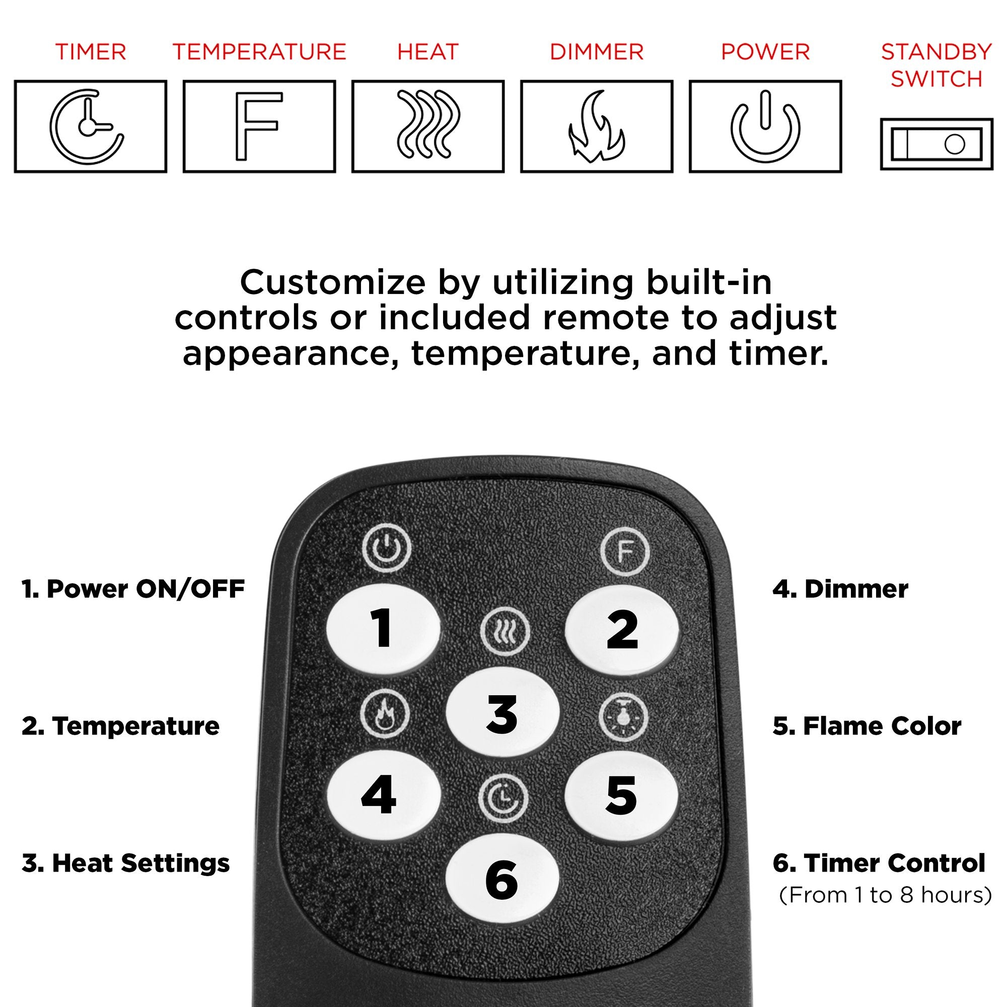 VARIOUS OPERATION MODES: Use the included remote control or touch panel with LCD display to control heat and flame settings, a timer up to 8 hours, and power