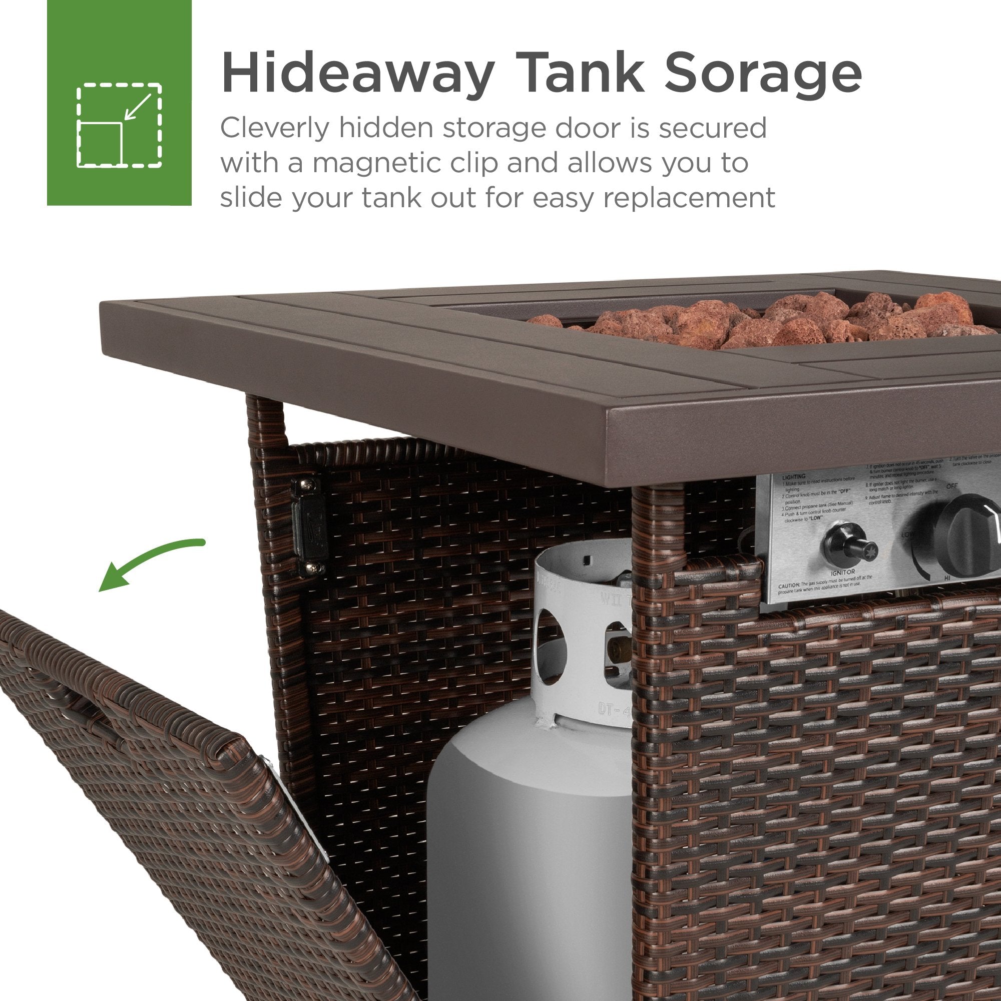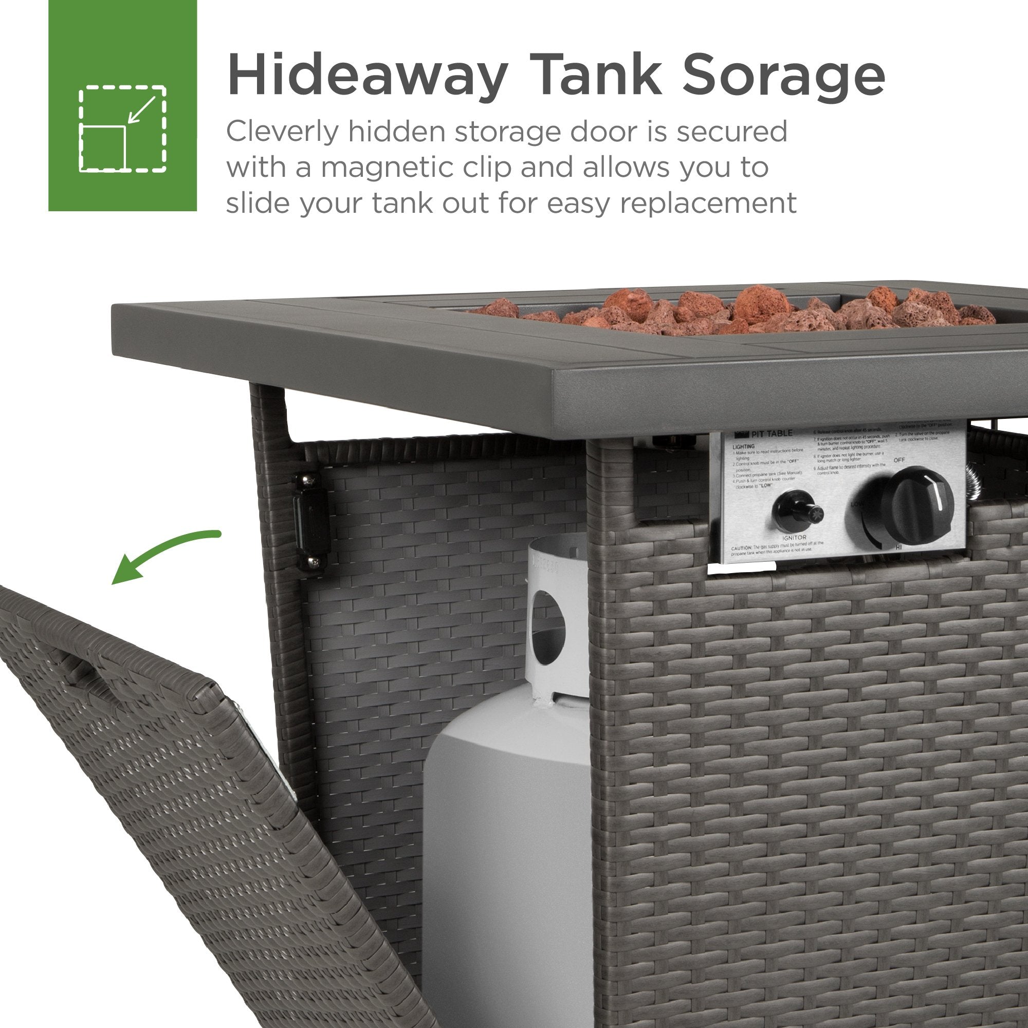 HIDEAWAY TANK HOLDER: Convenient gas tank holder is attached to the magnetic side door, so you can quickly change and conceal your propane tank