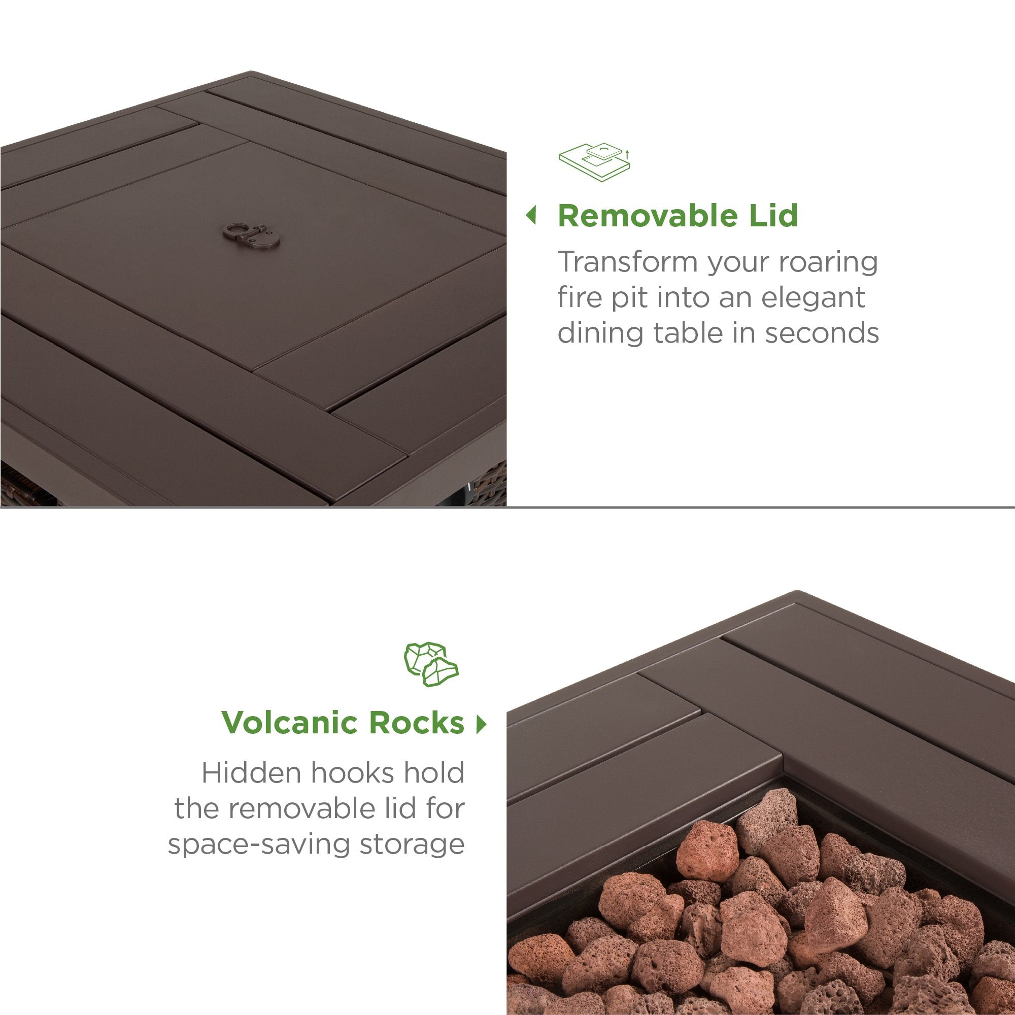 VOLCANIC ROCKS & STEEL BOWL: Ignite an inviting flame over a removable bed of lava rocks that trap and disperse heat while resisting corrosion