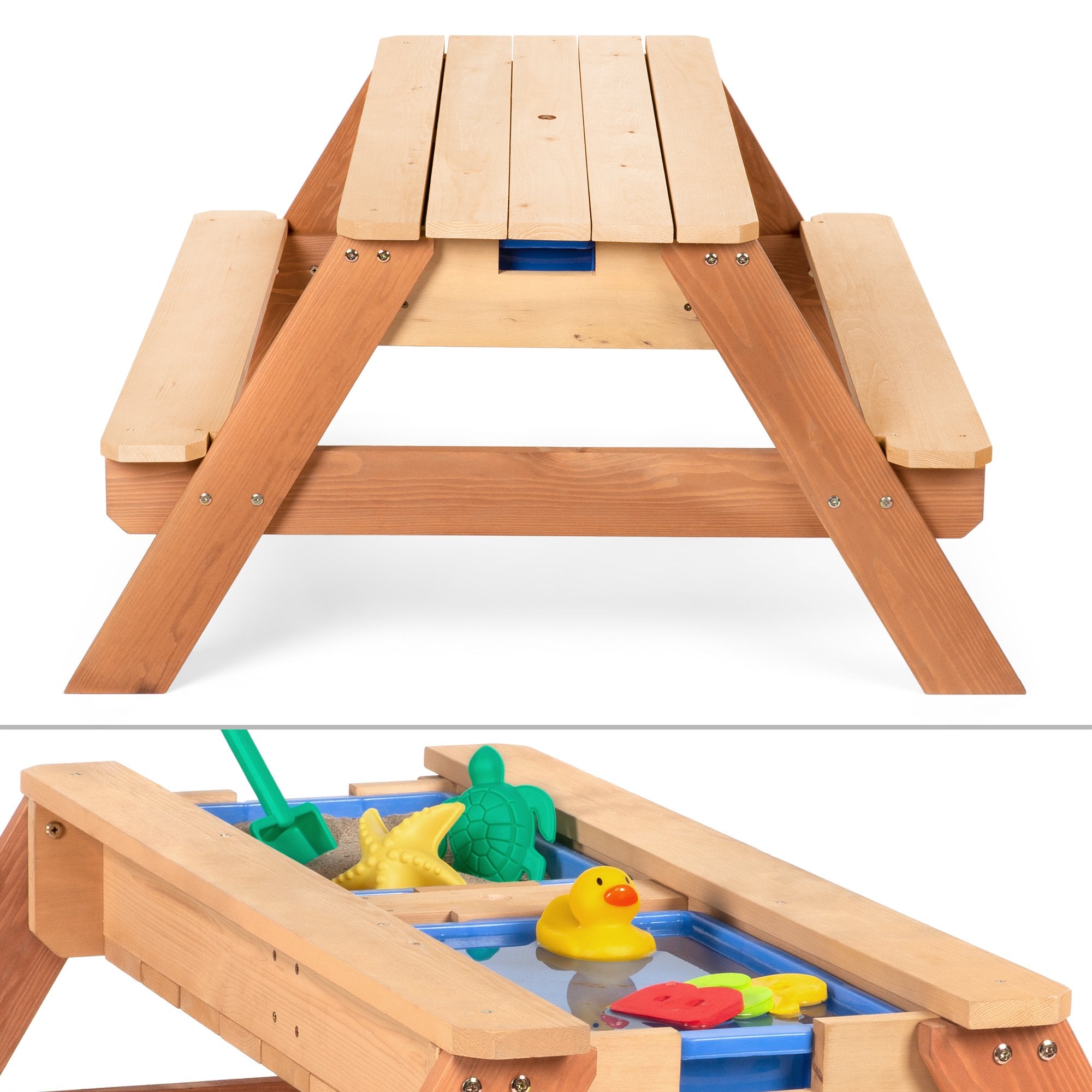 3-IN-1 DESIGN: This multipurpose picnic table set has a removable tabletop section with a small sandbox and water tub underneath, so kids can build mini sand castles or catch pretend fish