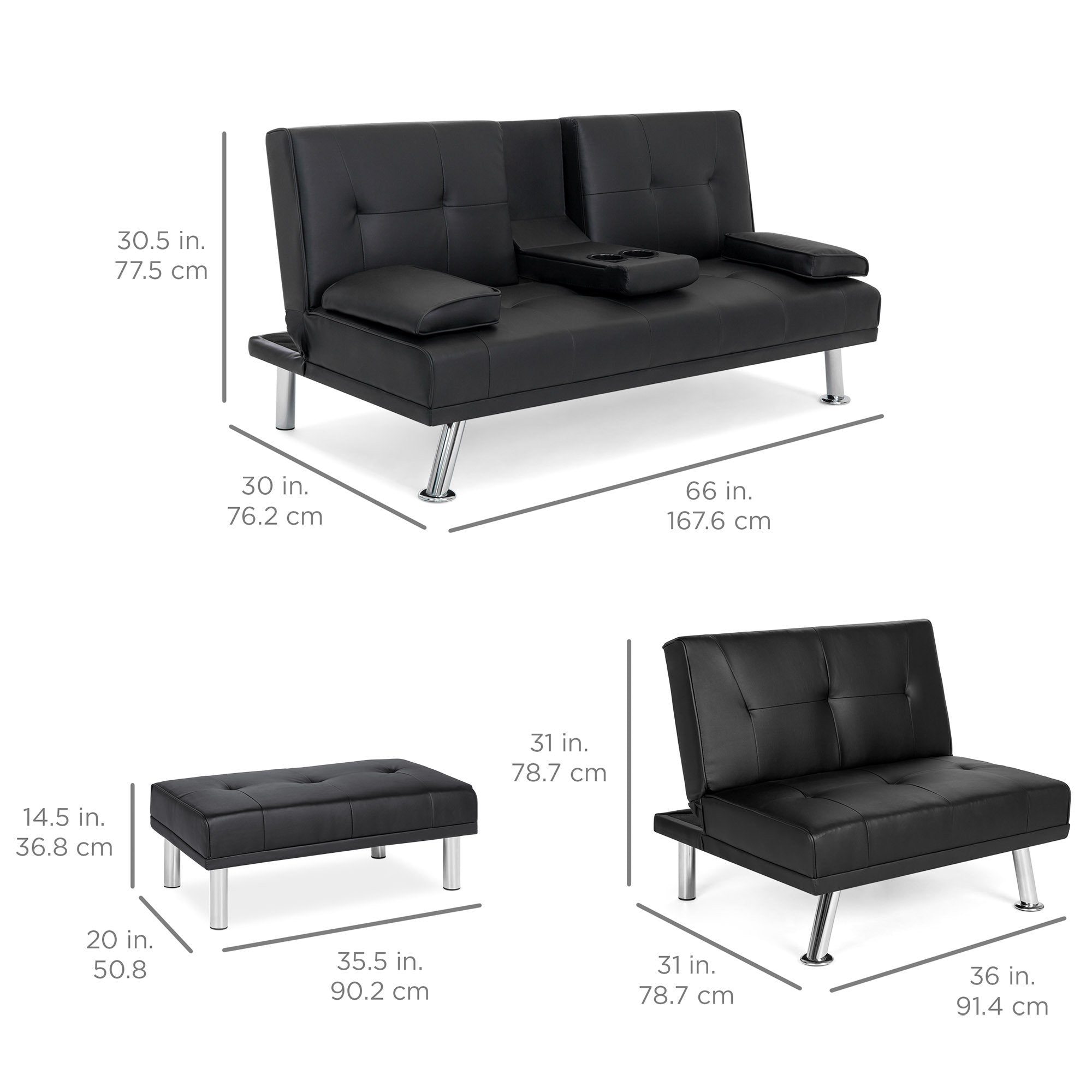 EASY ASSEMBLY: Each futon includes all necessary parts in a zip compartment in the base. For the ottoman, simply screw the legs in! FUTON DIMENSIONS: 30"(L) x 66"(W) x 30.5"(H); SINGLE SEAT FUTON: 36"(L) x 31"(W) x 31"(H); FOOTSTOOL: 35.5"(L) x 20"(W) x 14.5"(H)