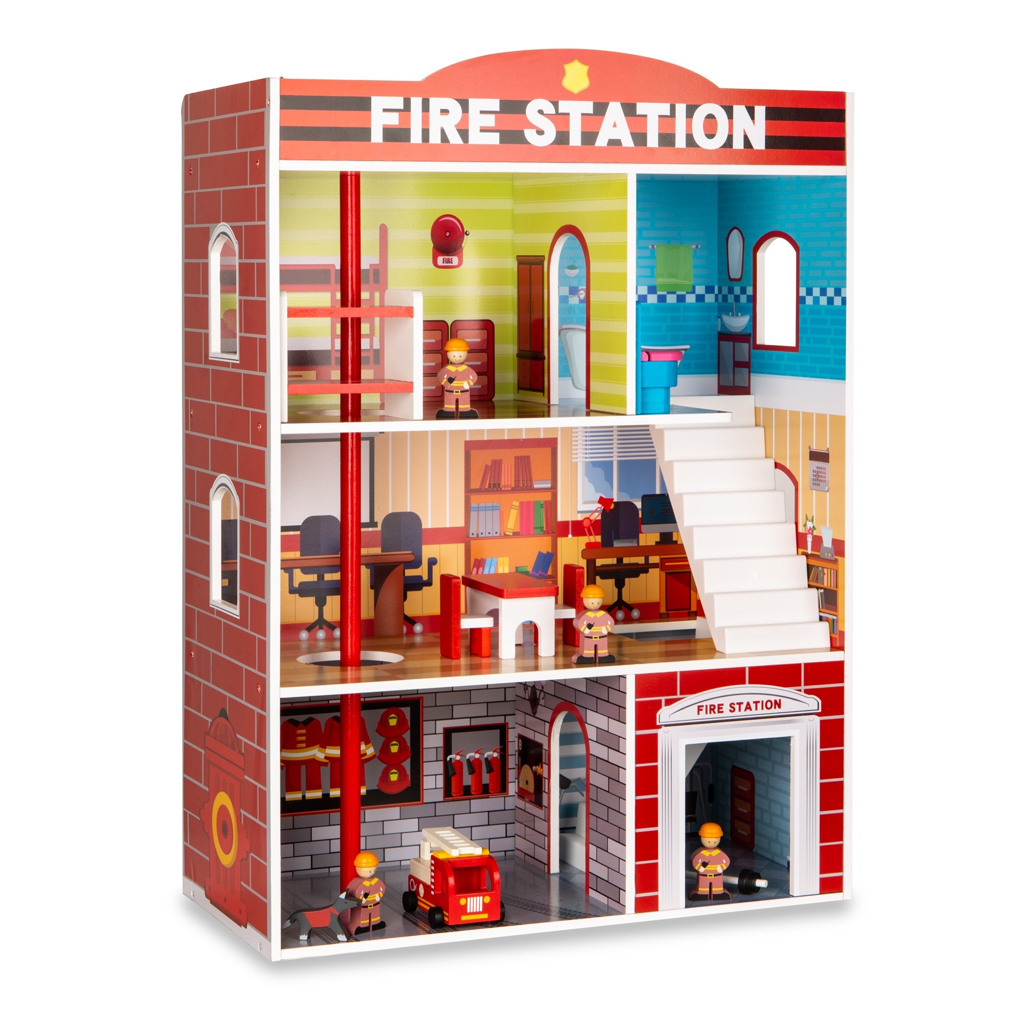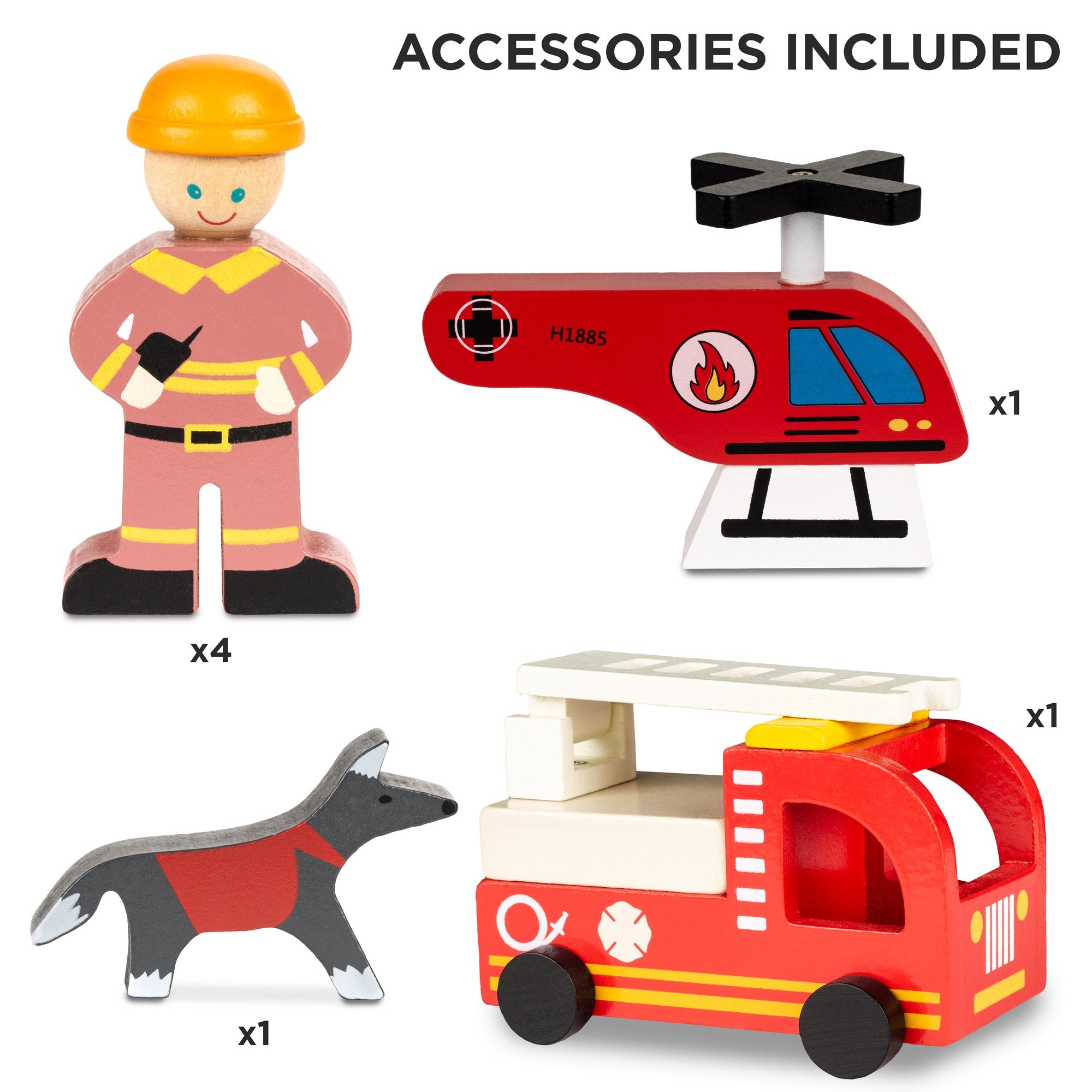 INTERACTIVE PLAYTIME ACCESSORIES: Your child will spend hours creating adventures with fun, wooden accessories; includes 4 firemen, a dining set, a small weight set to recreate the firefighter's life, and even a wooden puppy!