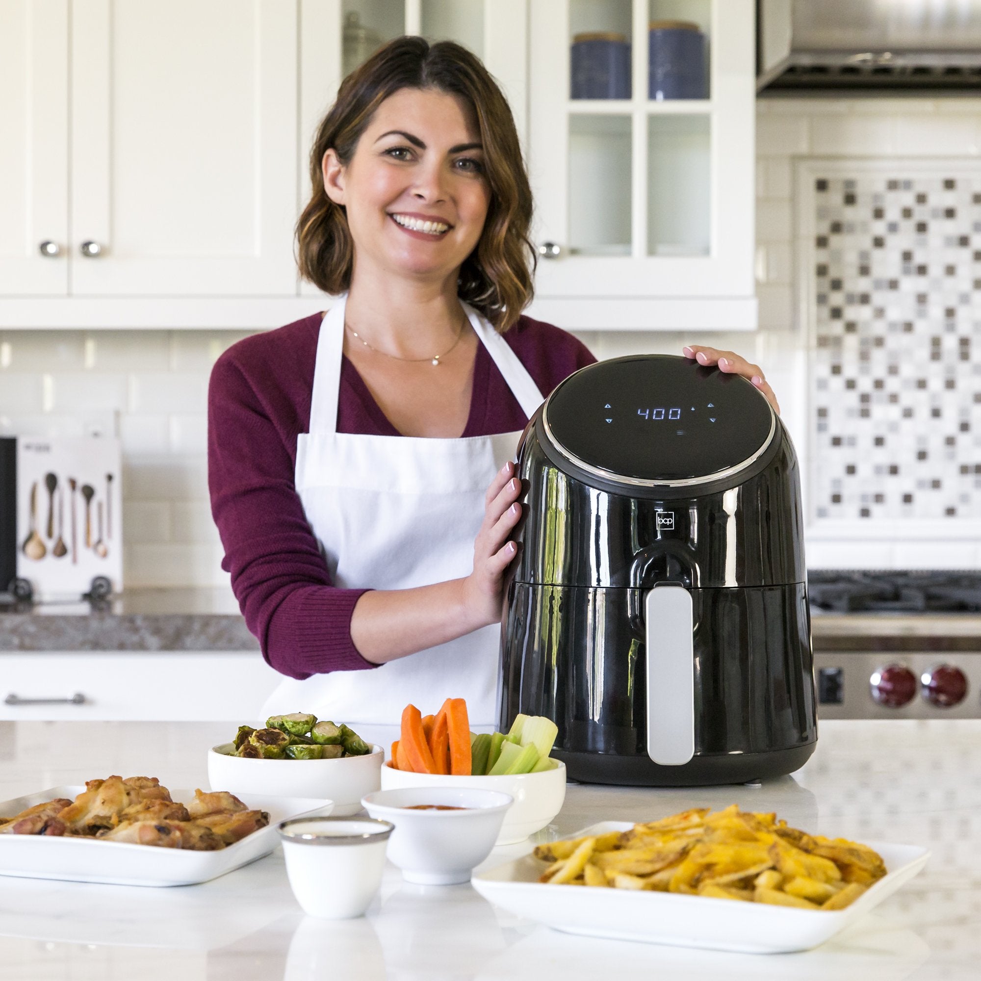 • TOUCHSCREEN DISPLAY W/ 8 PRESETS: Large digital LCD screen with updated technology displays cook temperature, time, and 8 pre-set options to cook veggies, seafood, baked foods, and more!