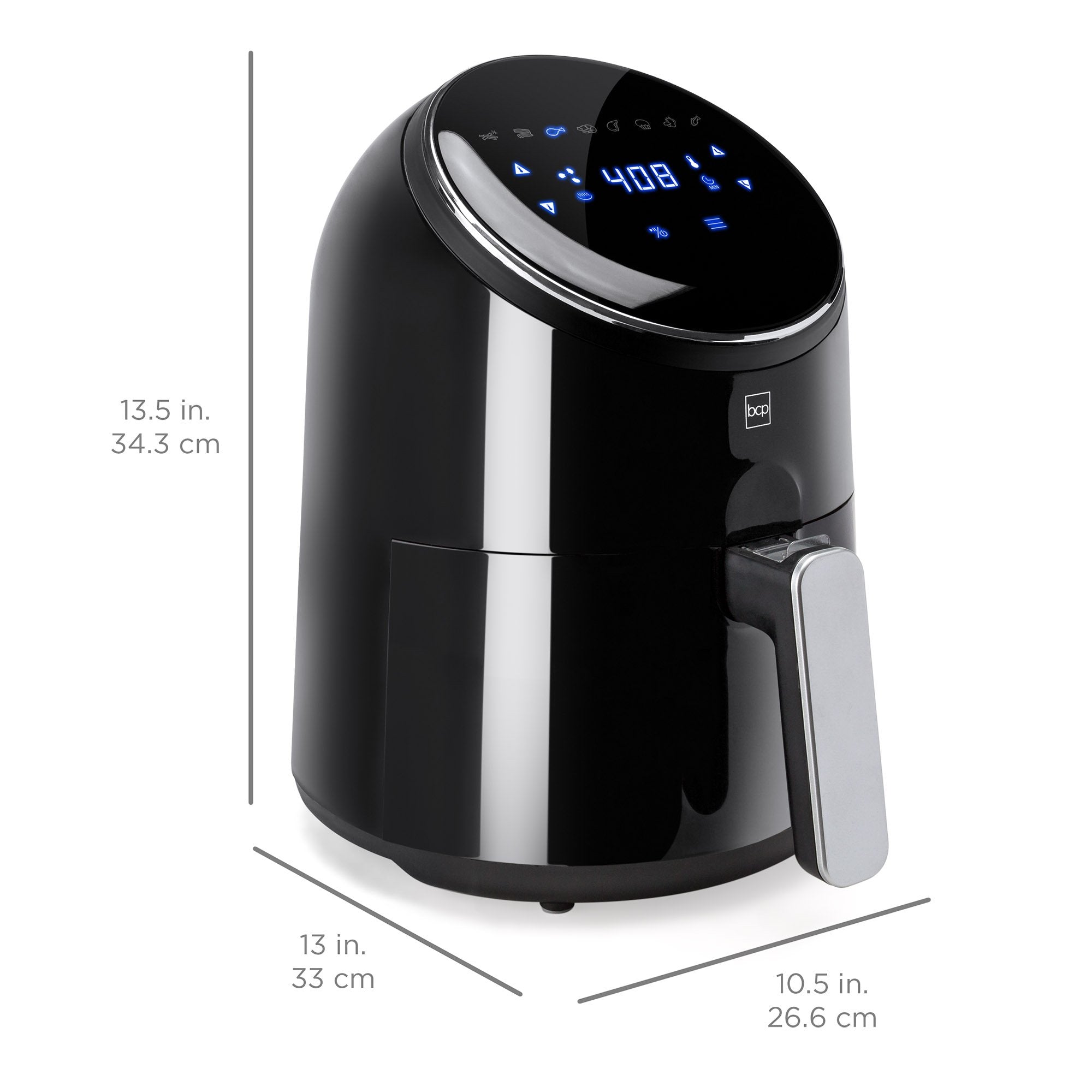 • OVERALL DIMENSIONS: 13"(L) x 10.5"(W) x 13.5"(H); Total Inner Capacity: 4.4qt; Basket Capacity: 2.75qt