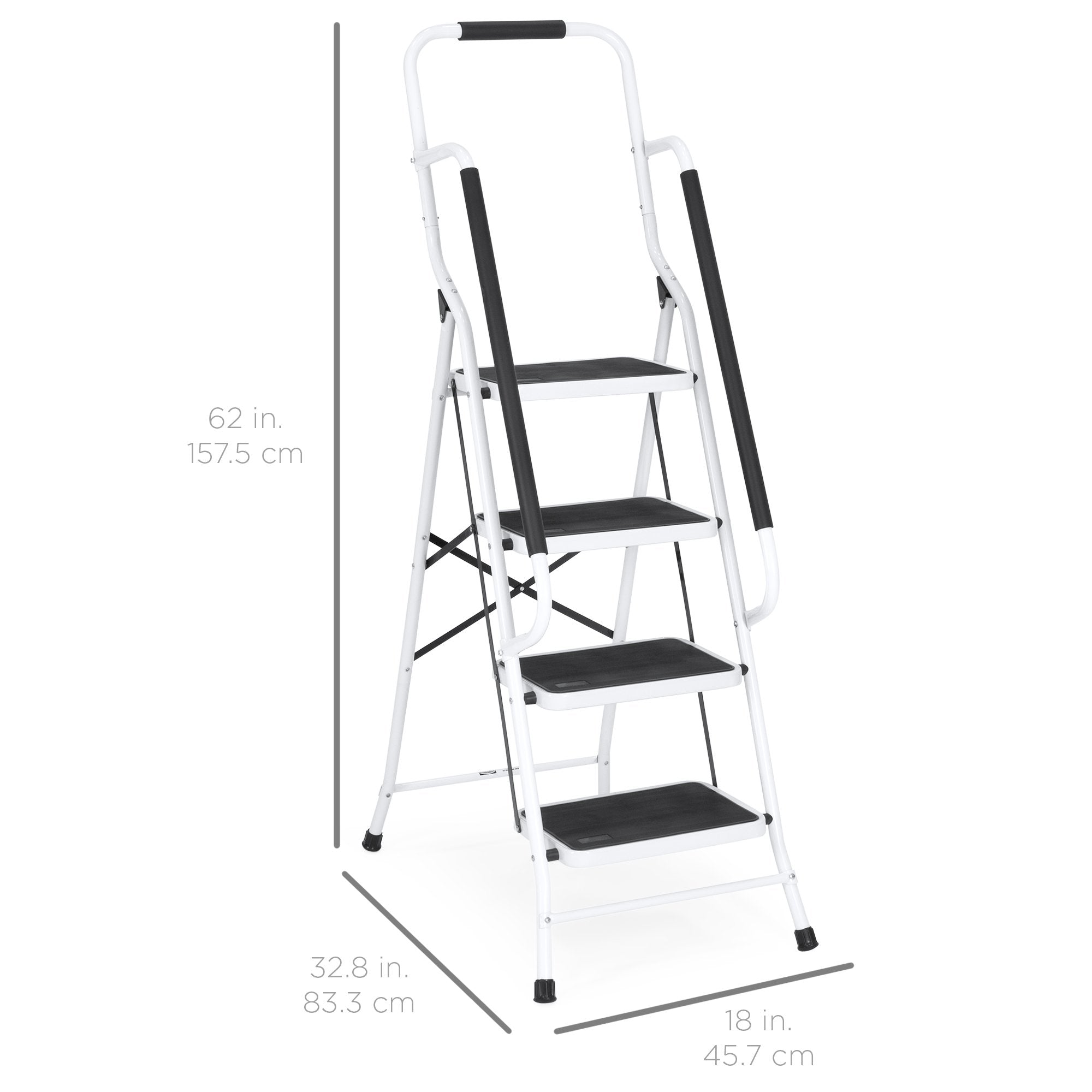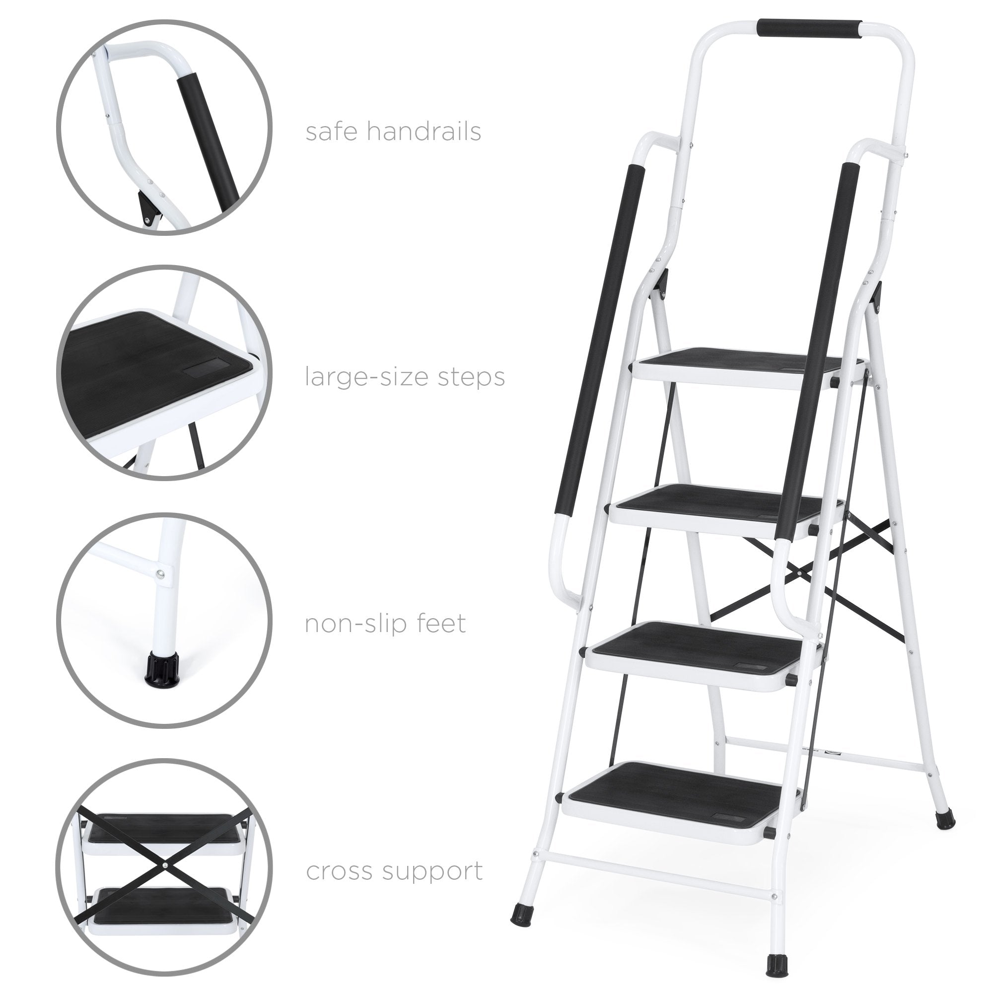 • STURDY DESIGN: Work in comfort with padded handrails, as well as metal crossbars and 4 non-slip feet that hold the ladder in place for optimal stability