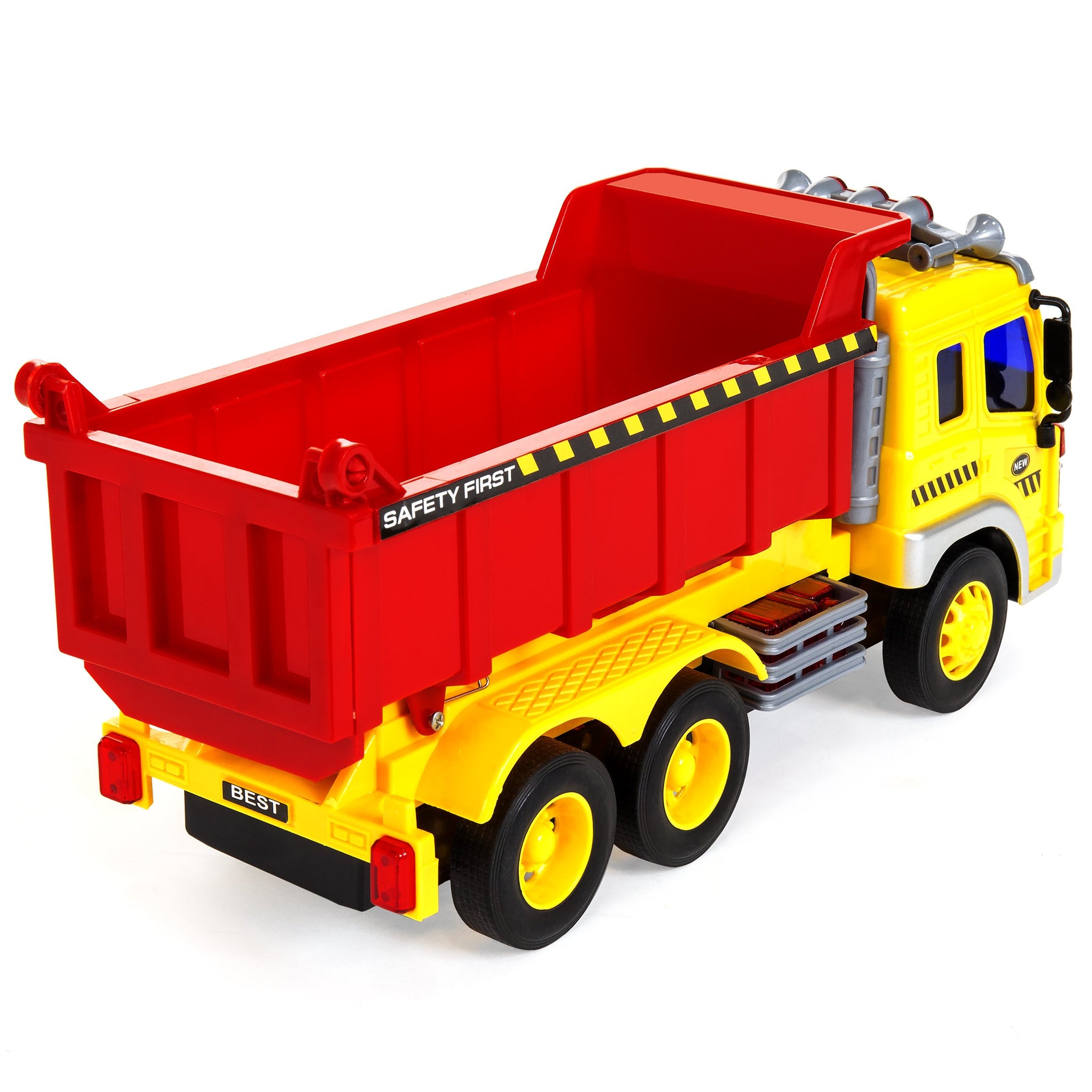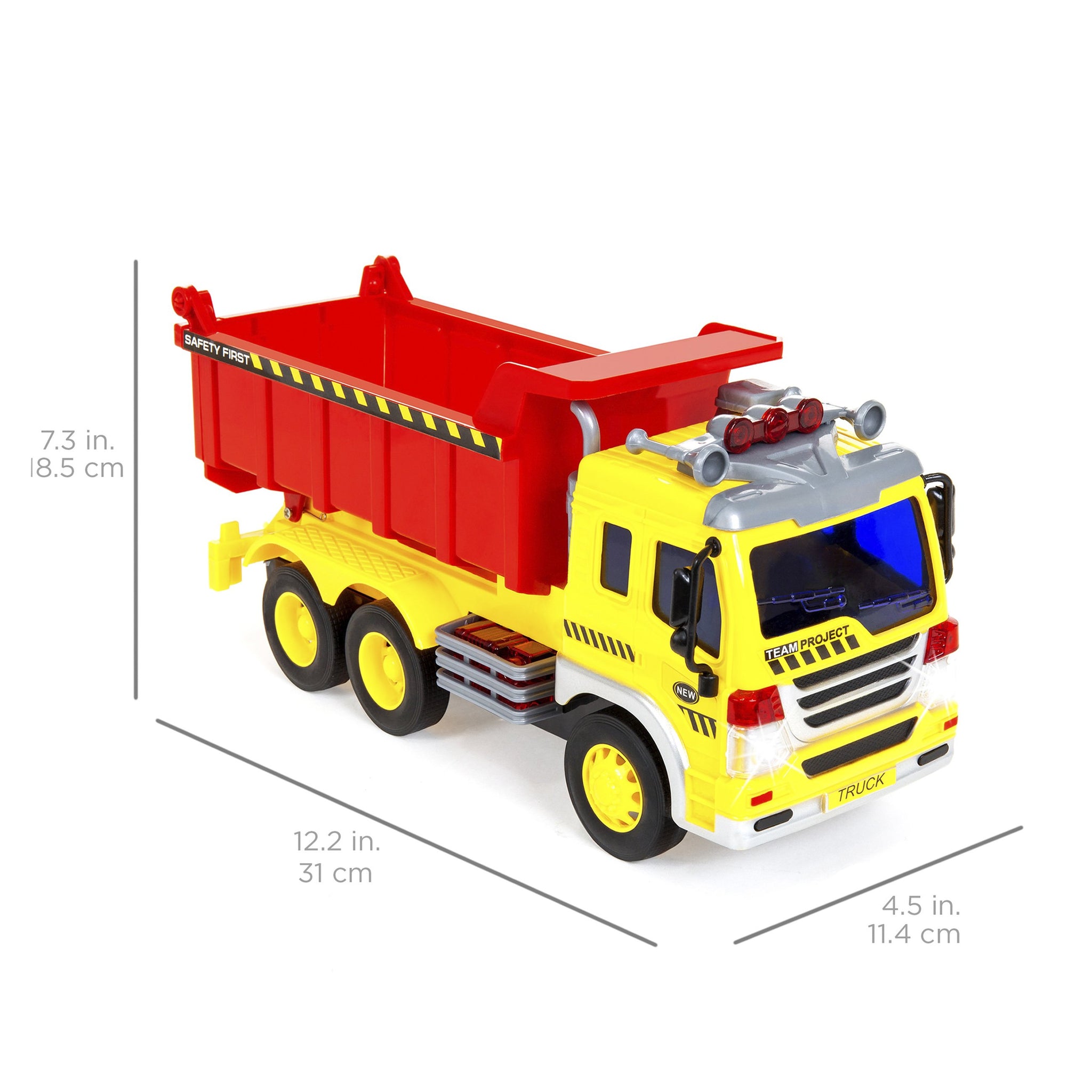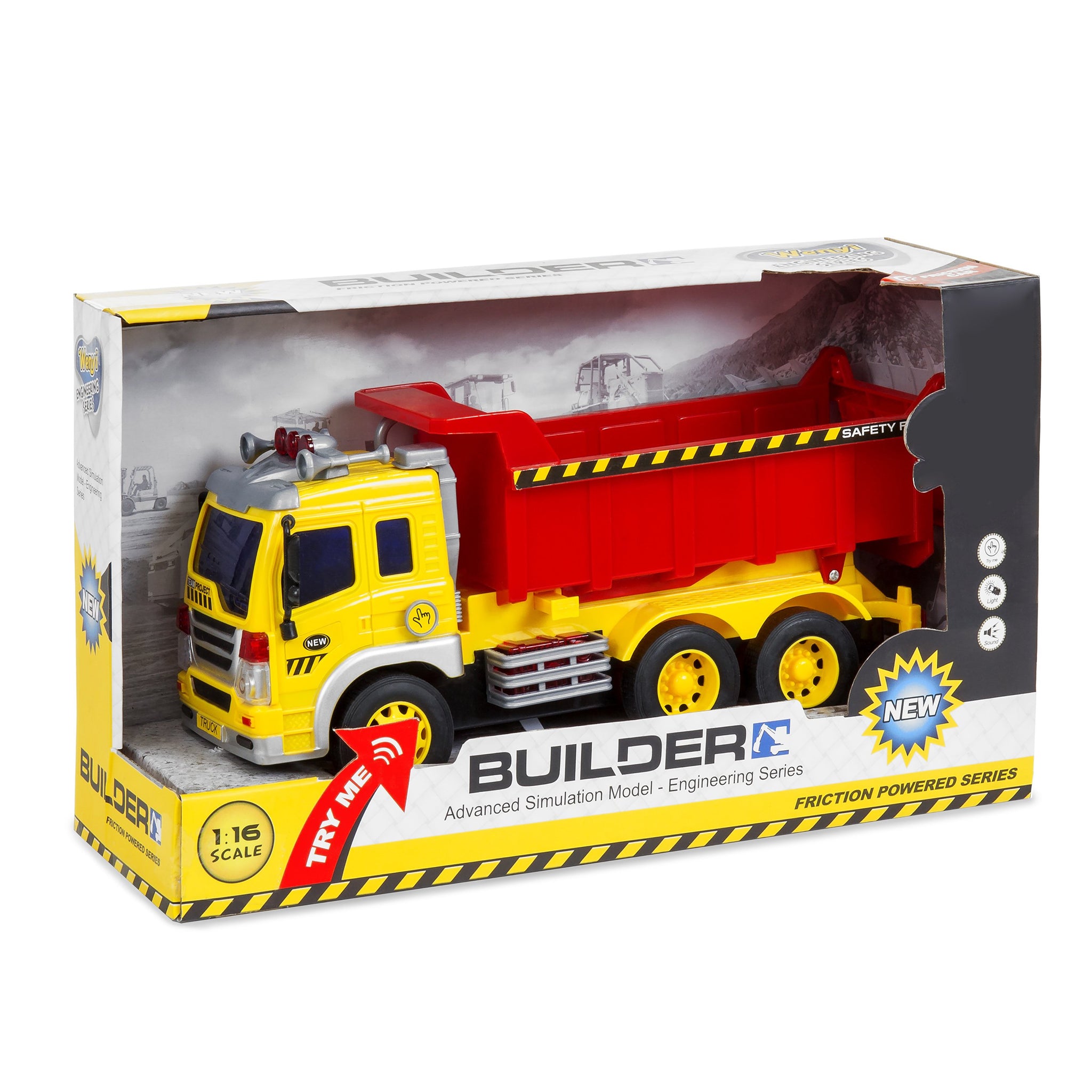 1/16 SCALE, FRICTION-POWERED DUMP TRUCK: Simply give the truck a rolling start and put it down to let it roll on its own with the friction motor! The dump bed also raises and lowers with a switch