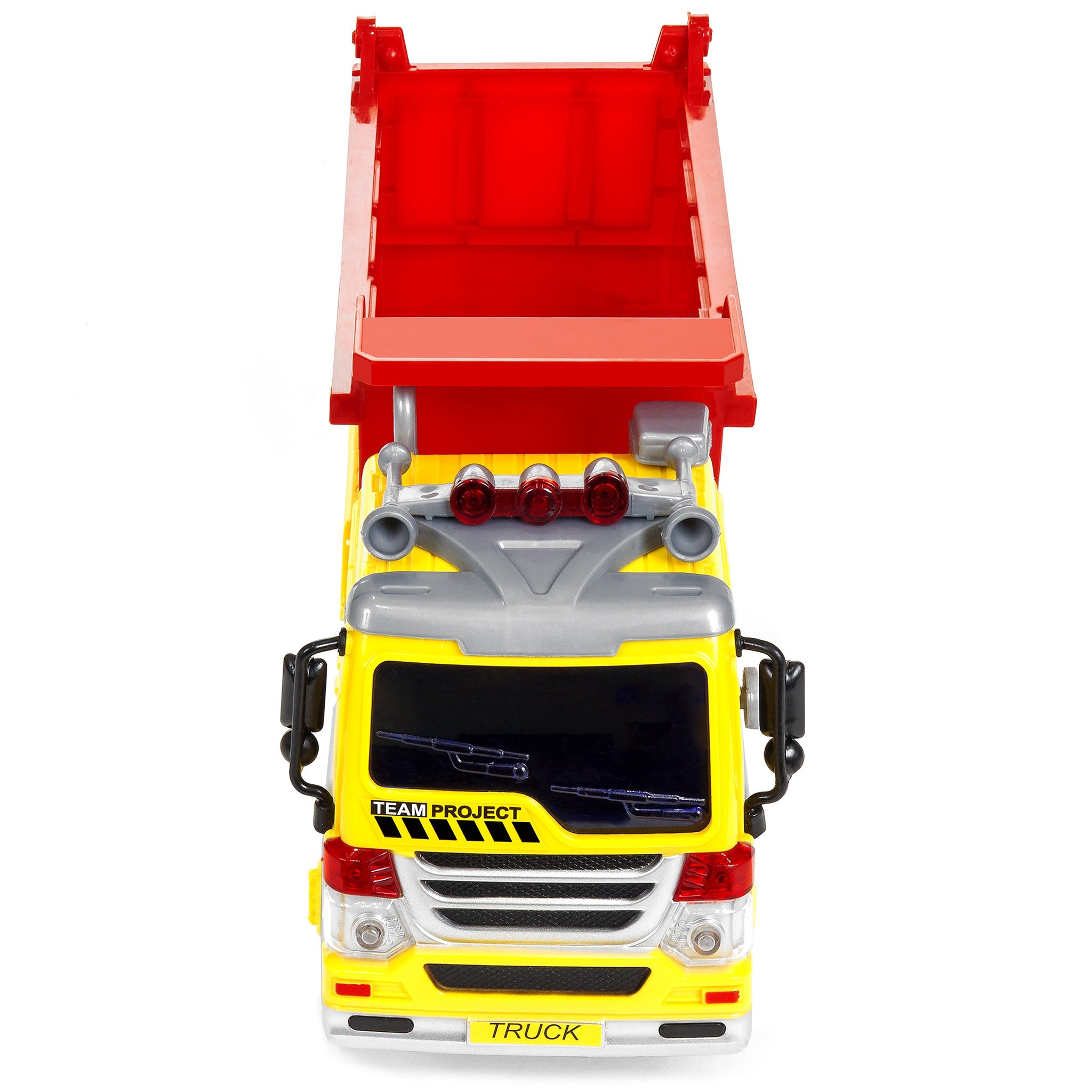 LIGHTS AND SOUNDS: At the press of a button, this dump truck will flash its lights and make realistic truck noises