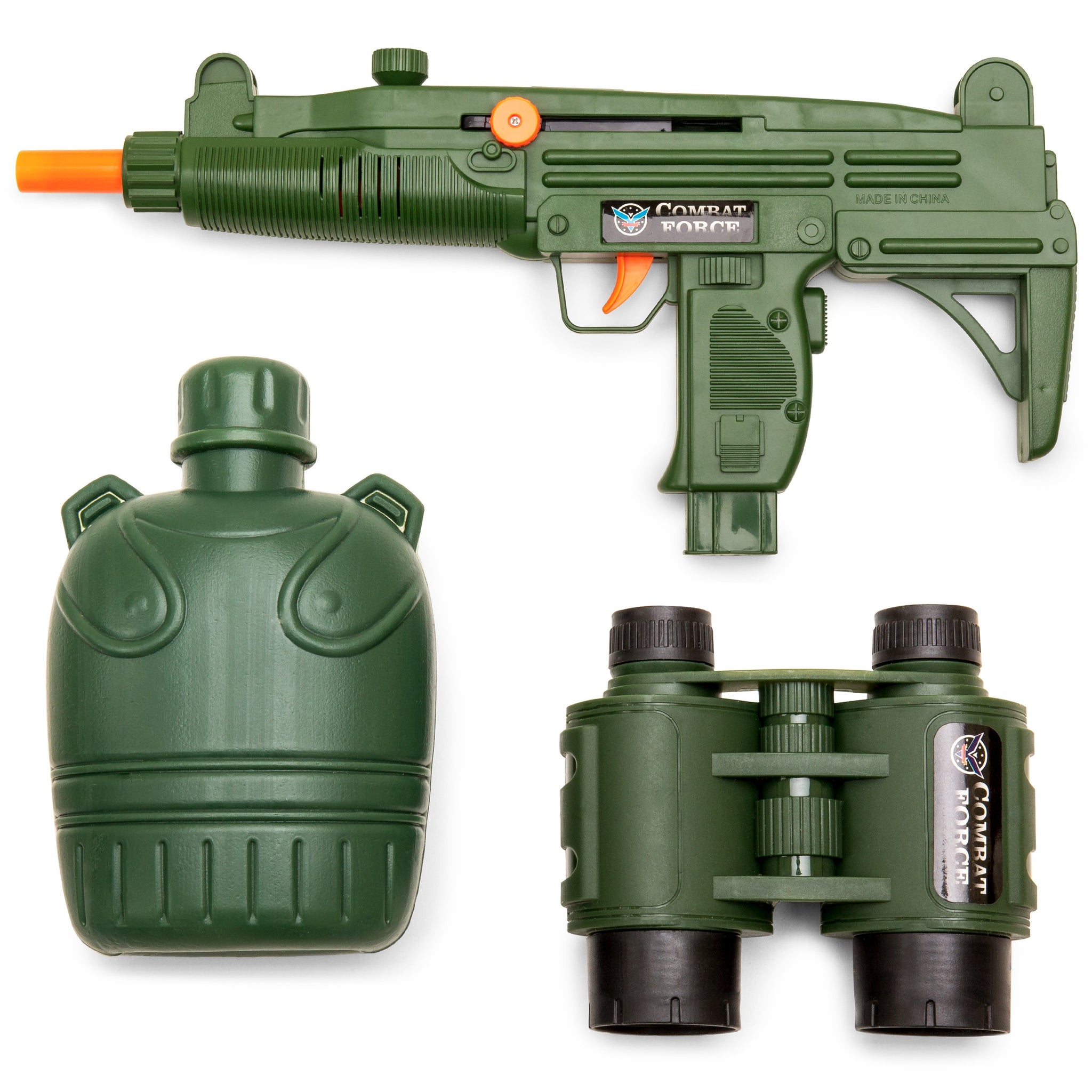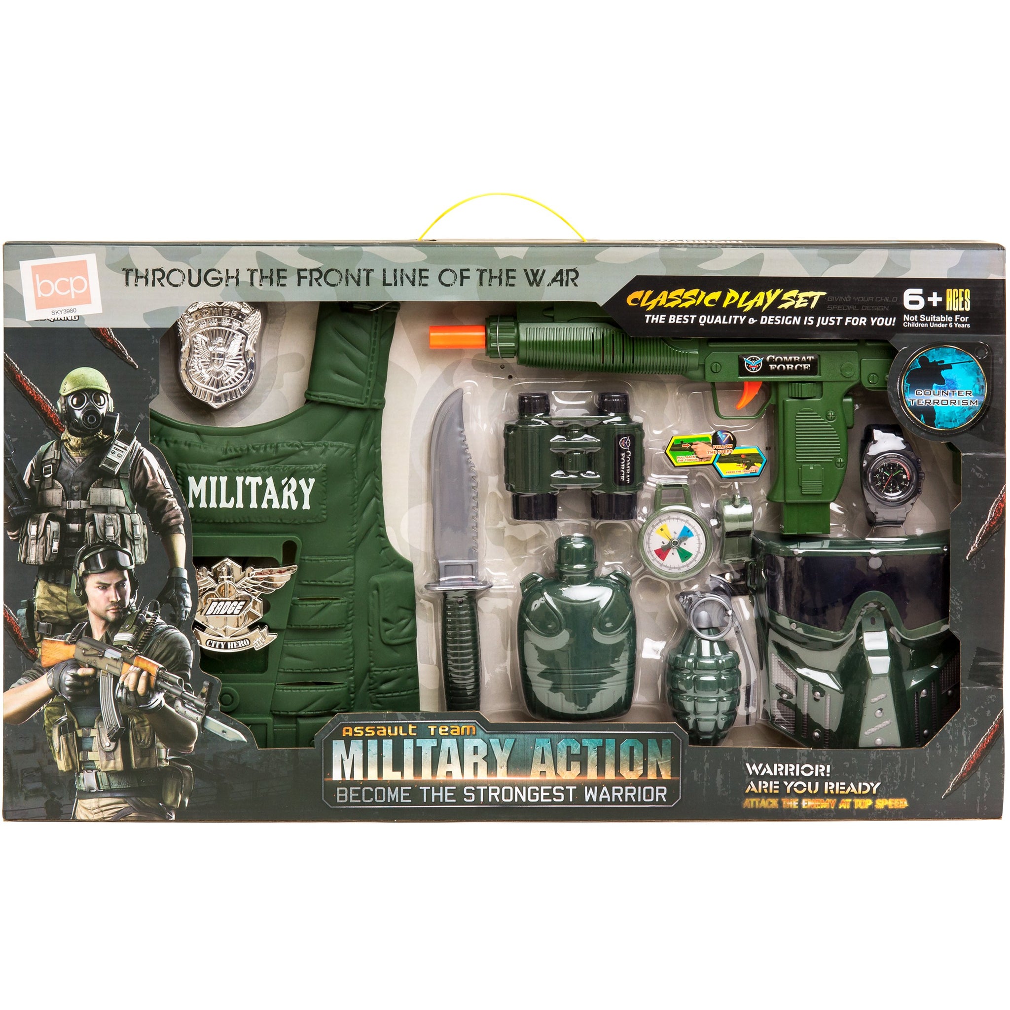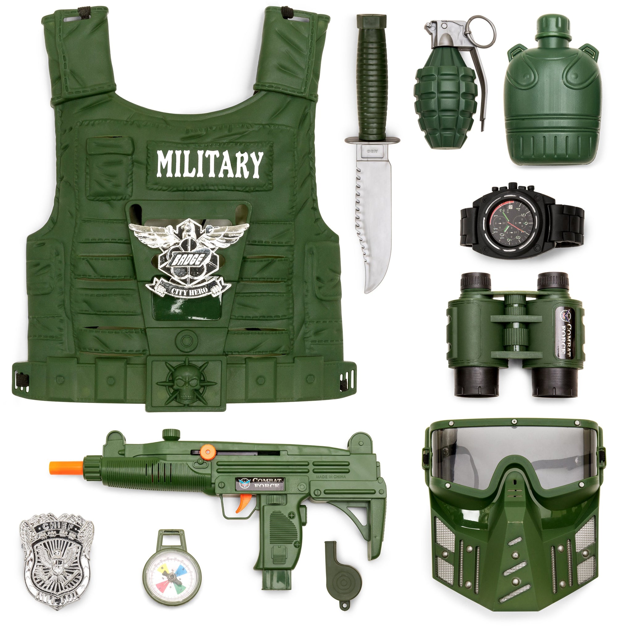 • Includes a military vest, mask, watch, binoculars, badge, canteen, whistle, compass, gun, grenade, and knife