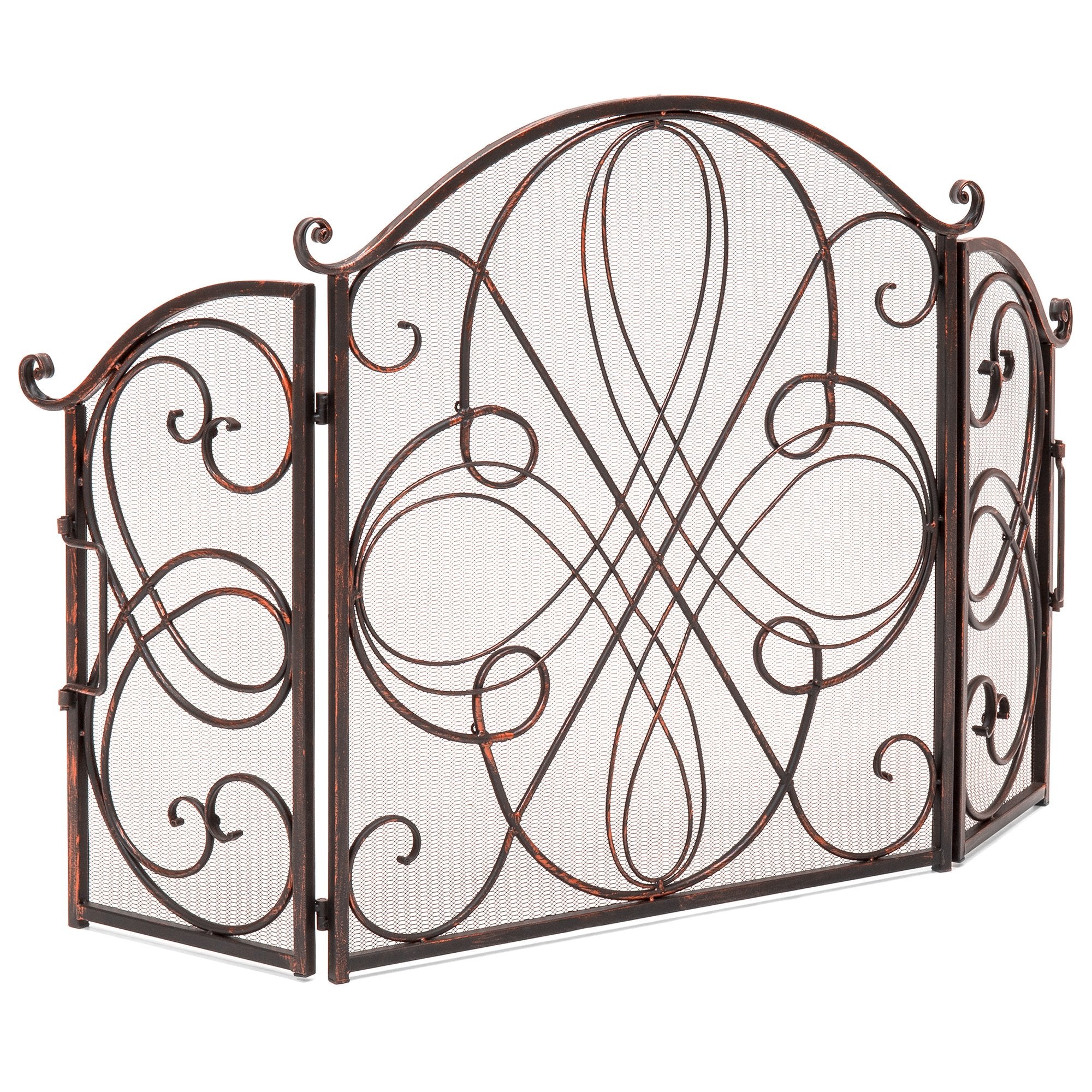3-Panel 55x33in Wrought Iron Metal Fireplace Screen Cover w/ Scroll Design