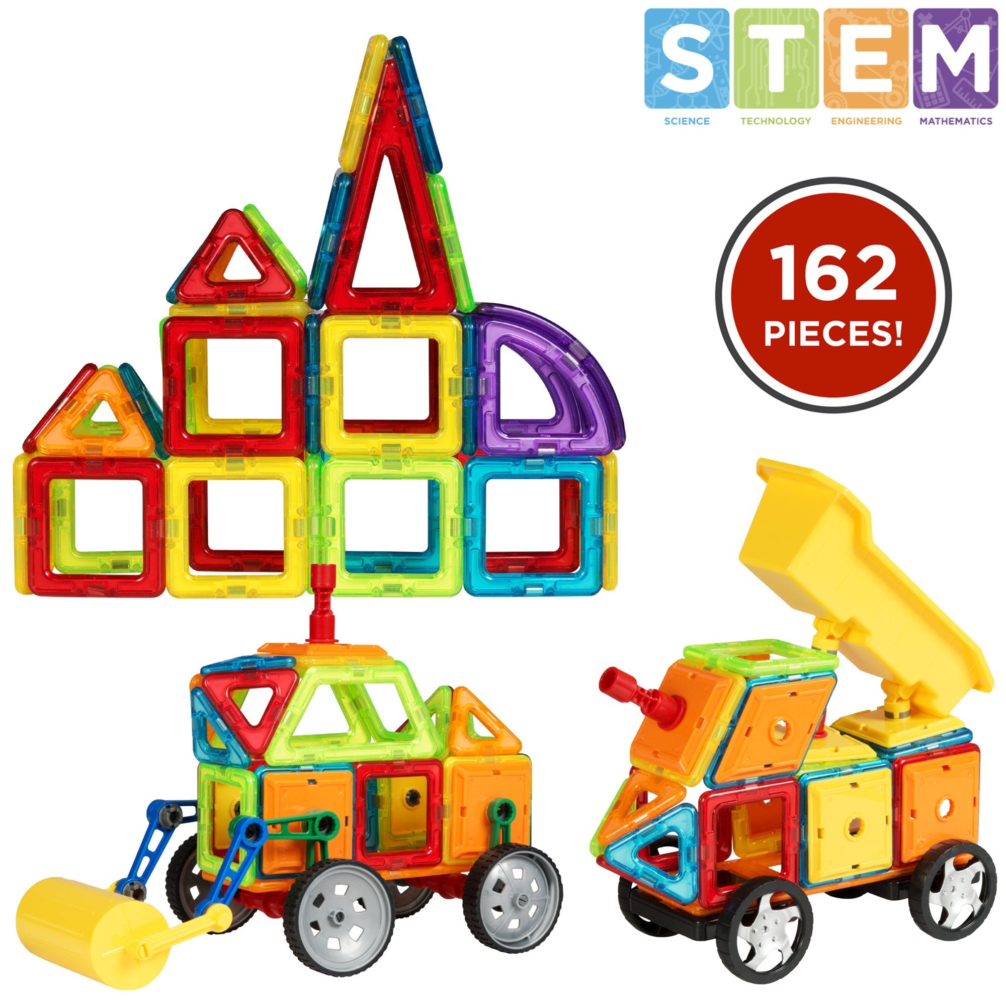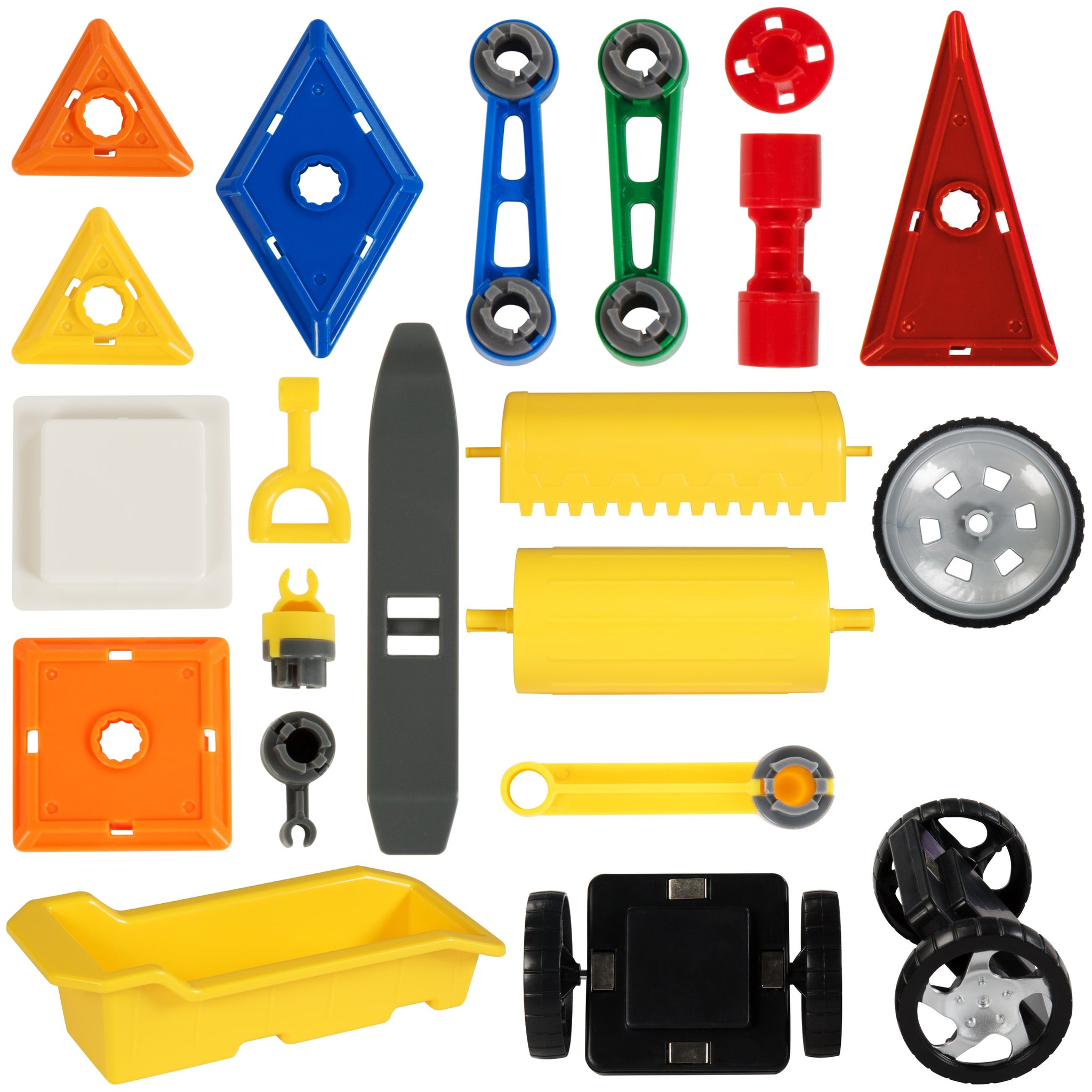 • 162-PIECE BUILDING SET: Shapes connect with magnets to be arranged into a steamroller, loader, dump truck, car, or an infinite number of other variations