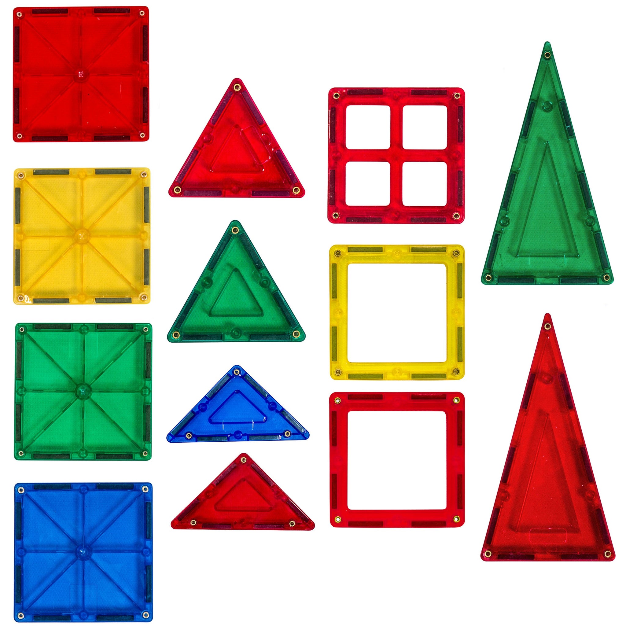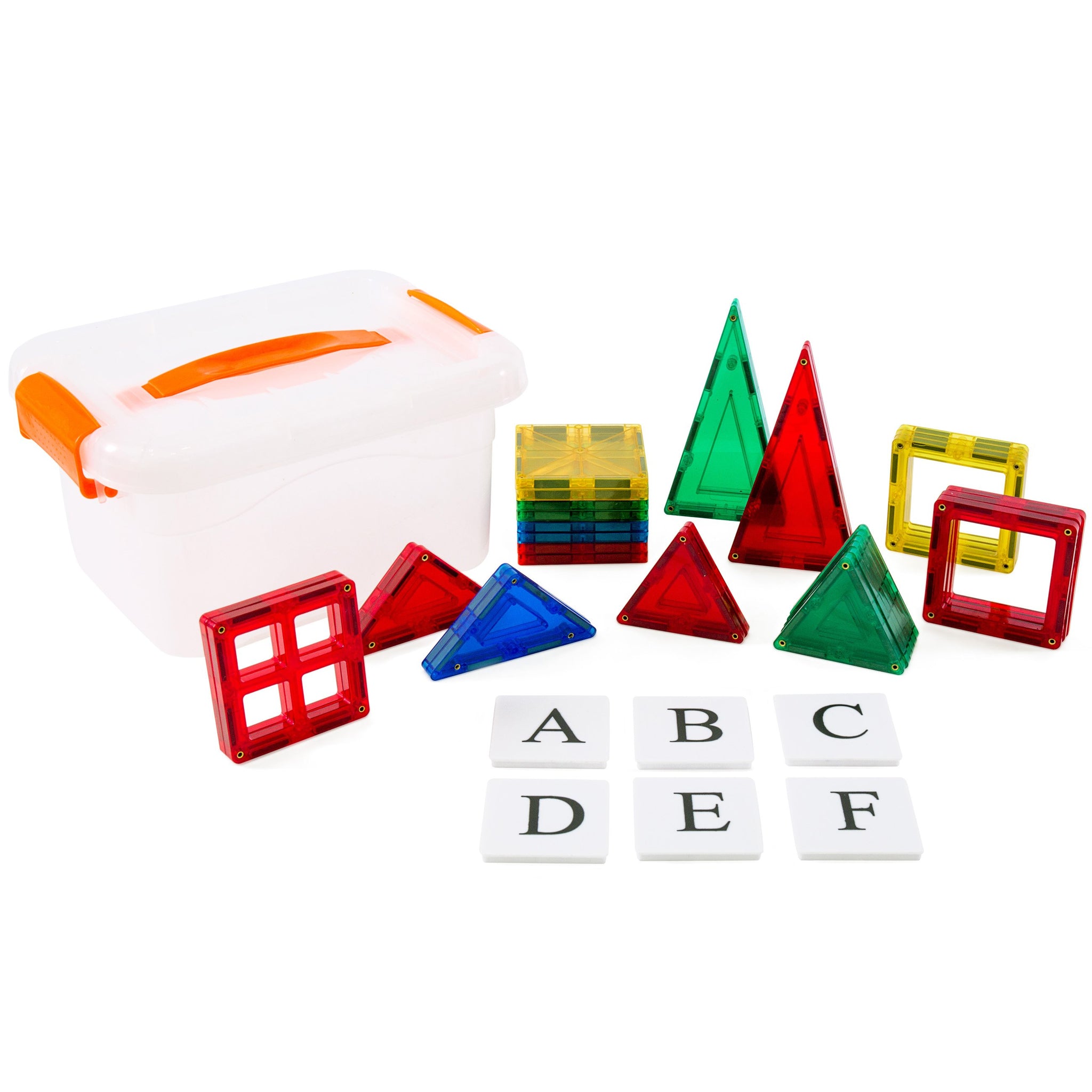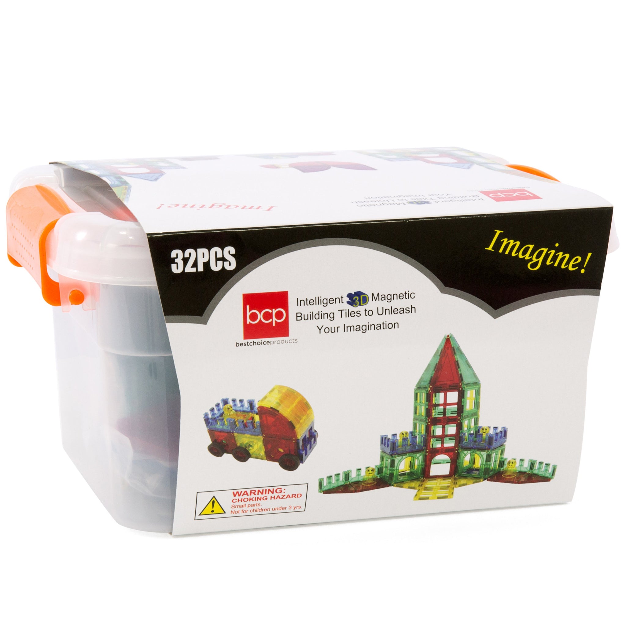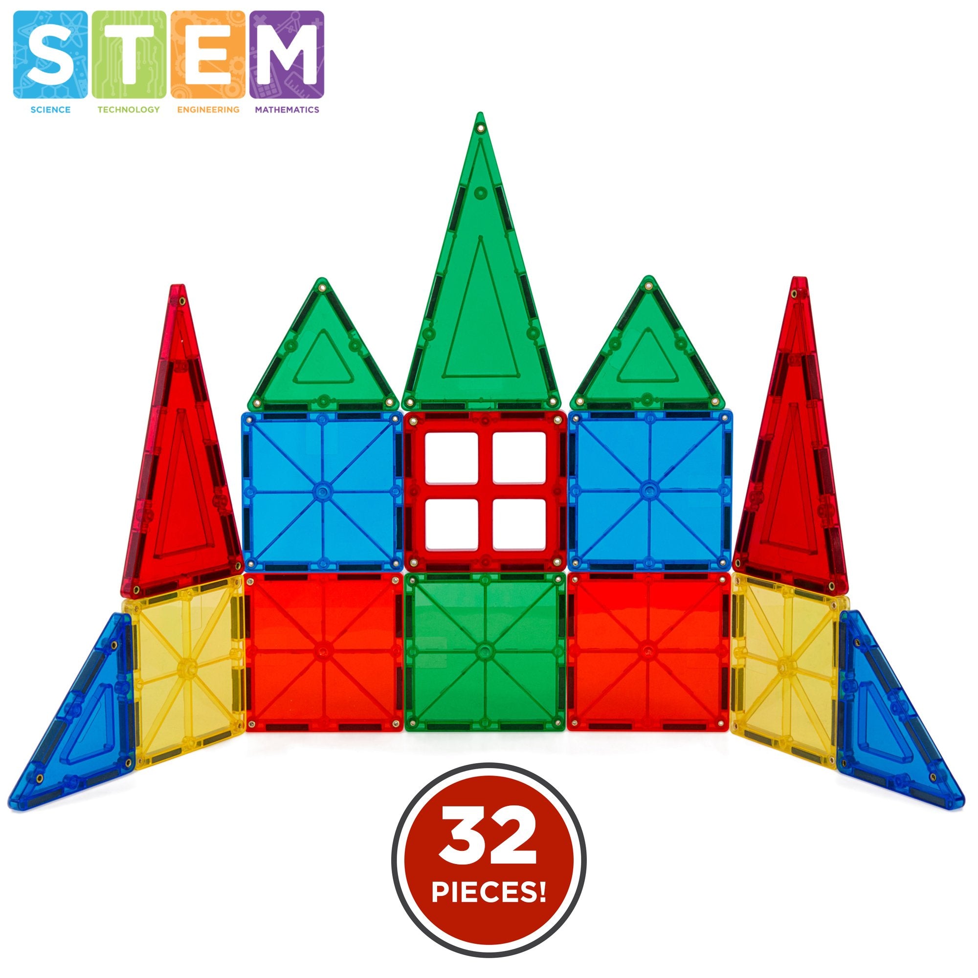 32 MAGNETIC TILES: Create cool 3D buildings, towers, structures and more with 32 colorful tiles that connect via magnets. Shapes include squares, triangles, and windows!