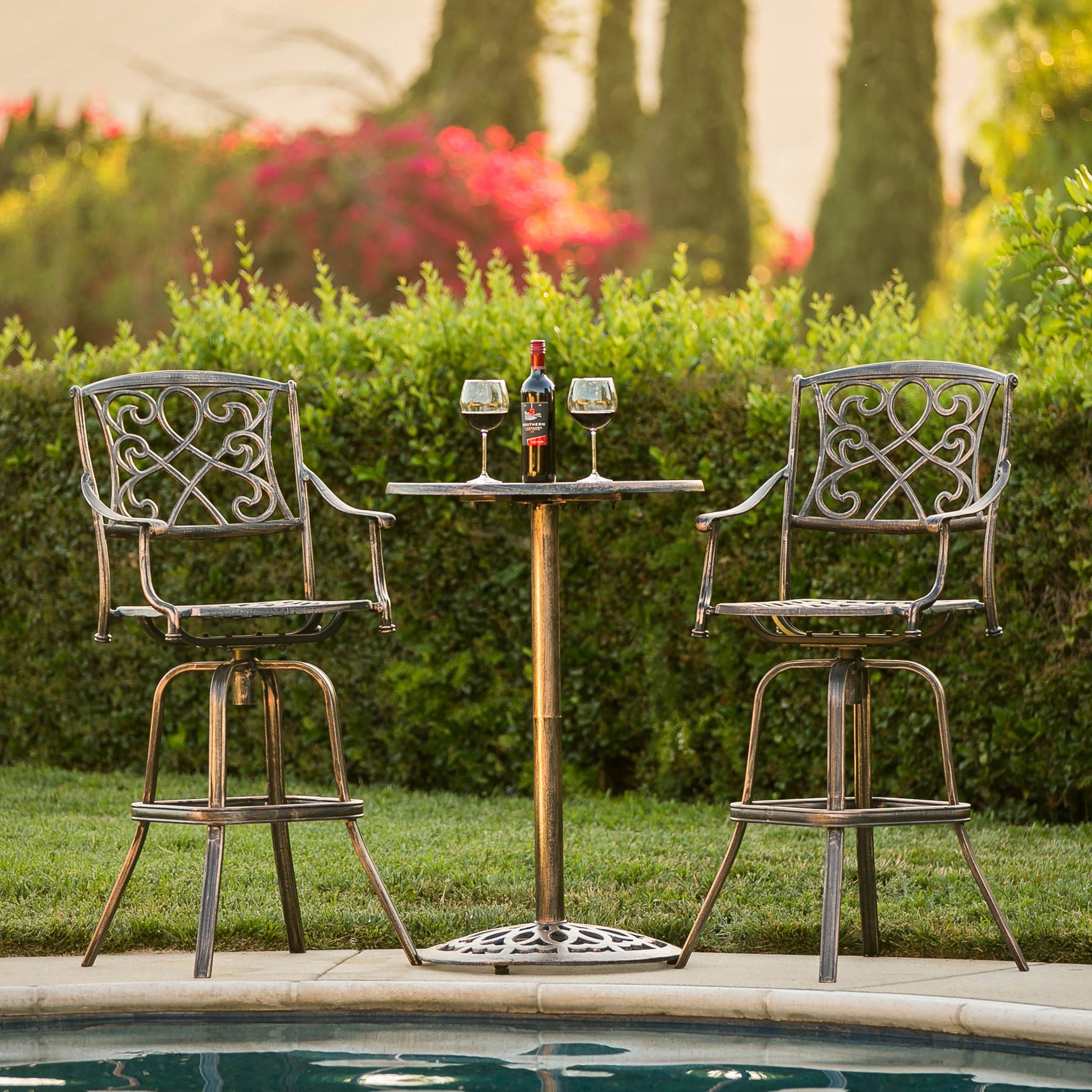 2-PERSON OUTDOOR SEATING: Two 360-swivel bar height chairs and tall pedestal bar height table are the perfect place to sit, relax, and make memories with family and friends in the backyard, garden, or by the pool